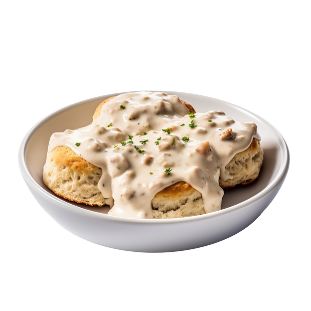 Two biscuits smothered in sausage gravy. Served with hash browns.