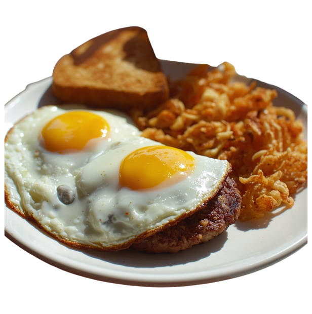 A hamburger patty with two eggs any style, hash browns, and toast.