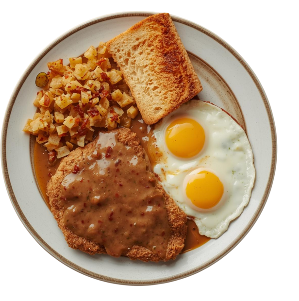 Tender breaded steak smothered in rich country gravy. Served with two eggs, hash browns, and toast.