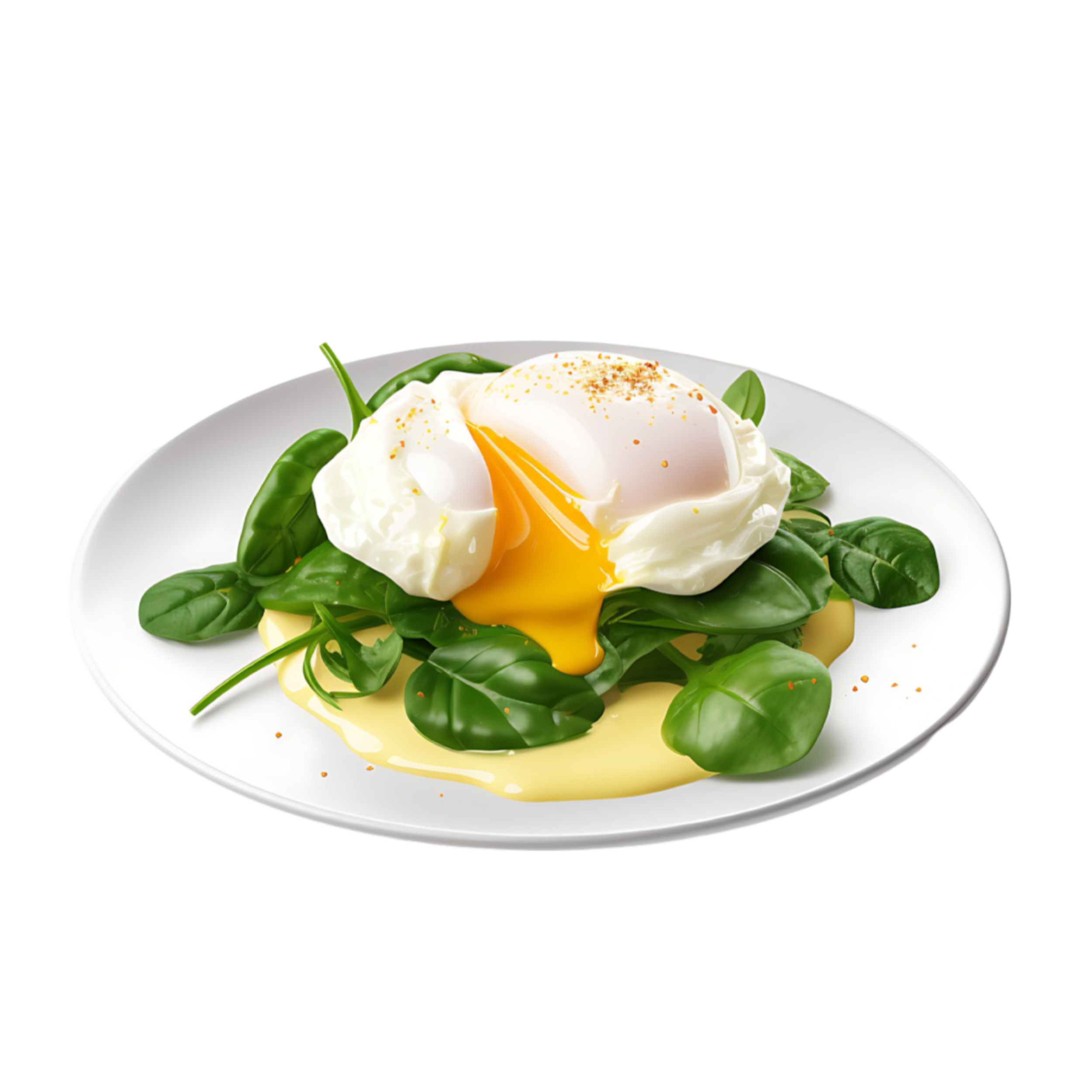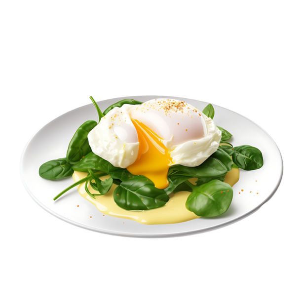 Split English muffin topped with spinach, tomatoes, poached eggs, and rich, tangy homemade Hollandaise sauce.