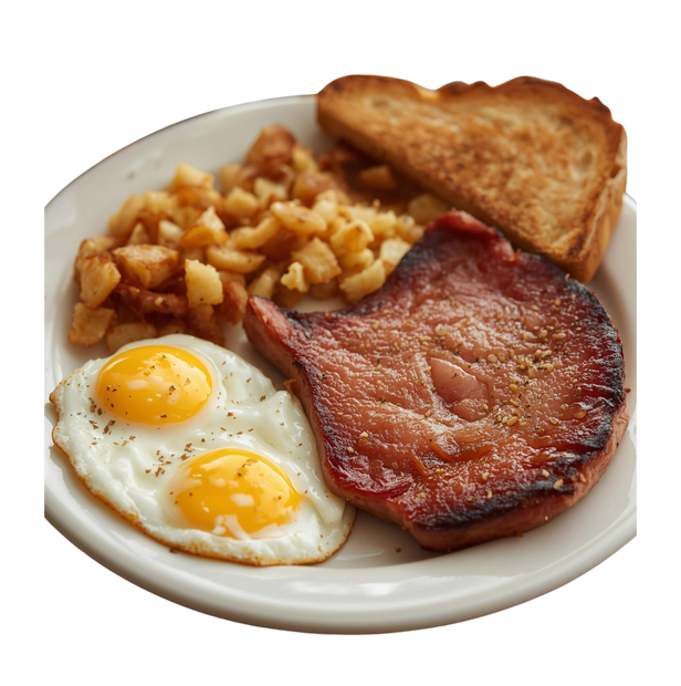 A sizzling 6-oz bone-in ham steak served with two eggs cooked your way, hash browns, and toast.