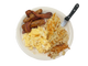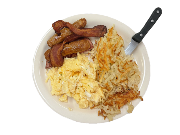 Three eggs, sausage patty, ham steak, bacon strips.