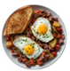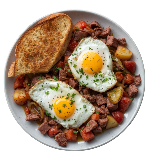 Chunked corned beef with red potatoes, onions, peppers, and herbs. Topped with two eggs any style. Served with your choice of toast.